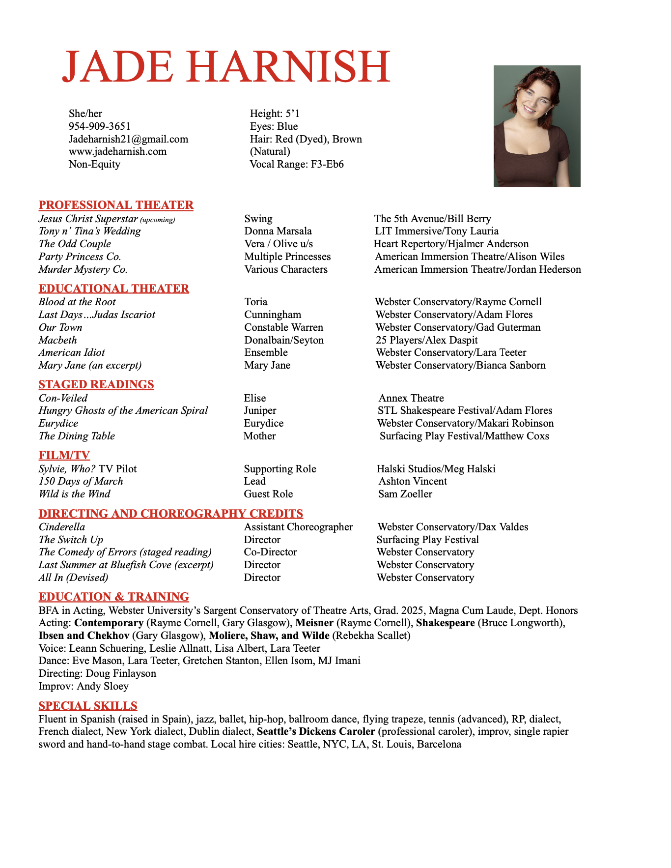 If you have made it this far, thank you! Below, you will find my headshots, resume, reels, production photos, and my contact information. Feel free to reach out, I’d love to get to know you, whoever you are.